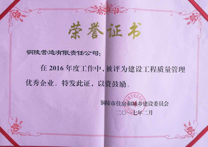 銅陵營造有限責任公司是國家住建部核準的房屋建筑總承包一級企業(yè)。2006年7月,企業(yè)二次改制為民營企業(yè),并更名為“銅陵營造有限責任公司”。目前,公司擁有房建施工總承包、市政公用工程總承包、鋼結構專業(yè)工程承包、建筑裝修裝飾專業(yè)工程承包四項壹級資質,機電安裝、起重設備安裝、建筑幕墻三項貳級資質,地基與基礎一項叁級資質。2008年通過北京恩格威ISO9001、ISO14001和OHSAS18001“三合一”體系認證。